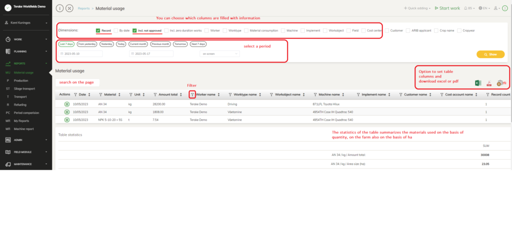 Material costs. The reports can be prepared by you according to the basis of the desired distribution. The first view is all materials in the selected period. It is possible to make additional inquiries based on the division. In this report, you can find all the costs and write-offs made for the objects.