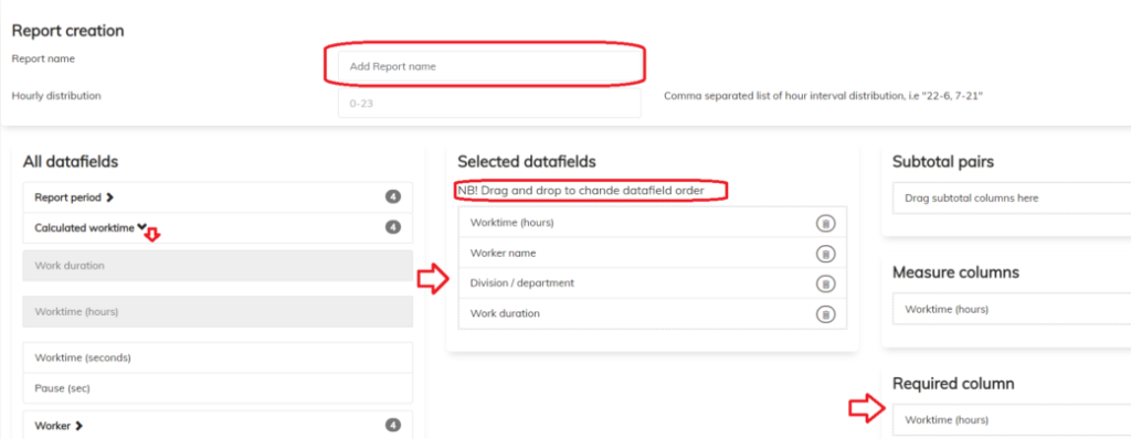 Define reports > All data columns > Selected data columns NB! The order of the selected columns can be changed by dragging with the mouse! Define subtotal pairs, required fields, and metrics