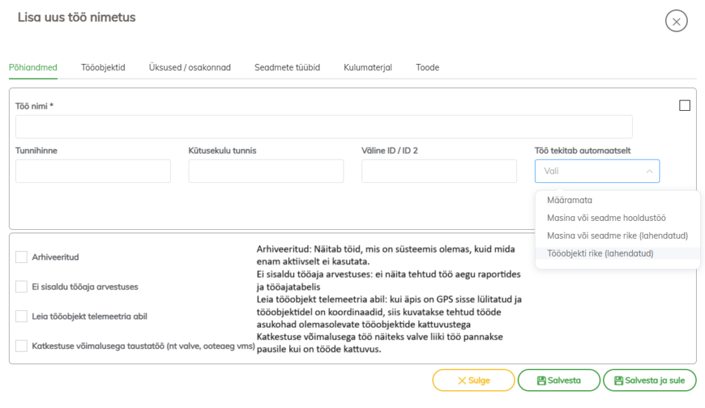 • Aktiivsed tööd: Näitab ainult neid tööde nimetusi, mida on võimalik planeerimisel ja tööde registreerimisel valida.
