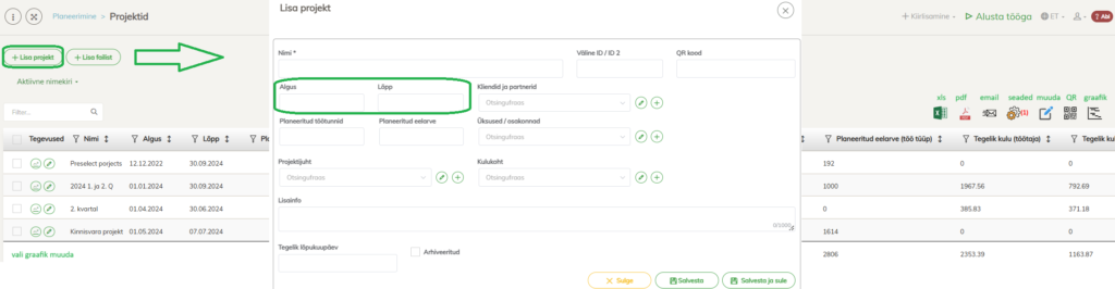 +Lisa projekt, nimeta see, lisa kindlasti periood ehk algus ja lõpp. Võimalik siduda kliendi, kulukoha ja osakonnaga ja määrata projektijuht. QR kood on äpis valimiseks lihtsustamise võimalusena ning väline ID/ ID2 näiteks raamatupidamisega seostamiseks.