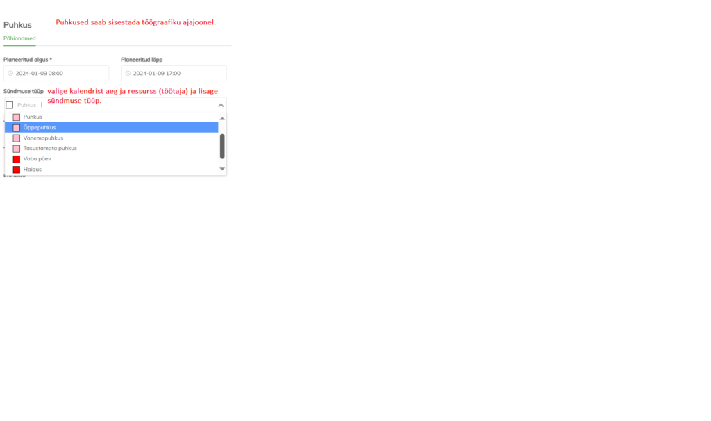 sisestatud puhkused siis siin on näha tabeli kujul ja nimekirjana kõik lisatud puhkused valitud perioodil ja töötajate kaupa