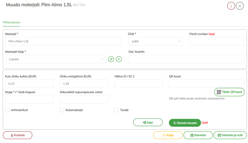 Avades materjali sellele klikkides või pliiats/muuda nupuga saate lisada alustuseks kõik põhiandmed ja valida, kas tegemist on kulumaterjali või tootega ning sisestada dialoogi alumises servas esimese laoseisu.