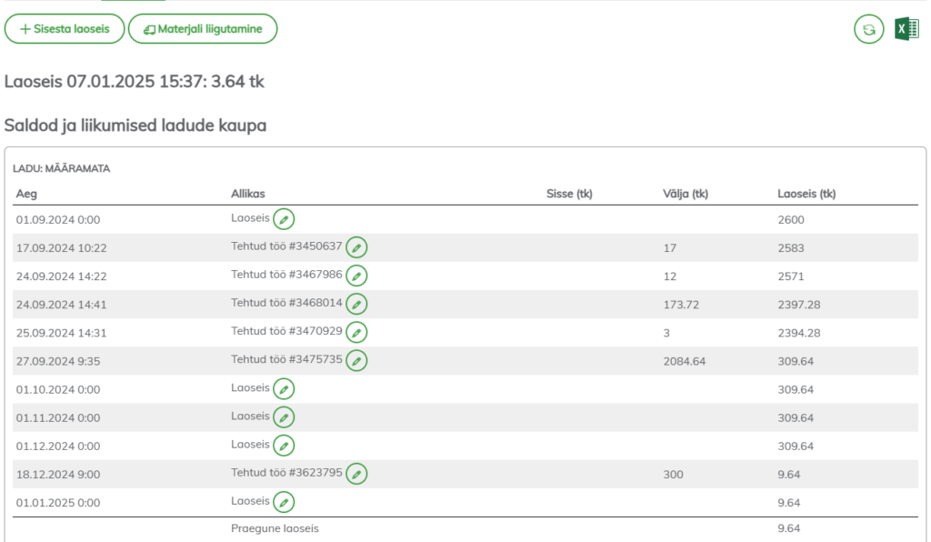 Laosesi sakk/TAB näitab saldod ja liikumised ladude kaupa. Allikas ütleb millise sisendiga laoseis muutus: laoseis (sisestus), tehtud töö, liikumine/transport
