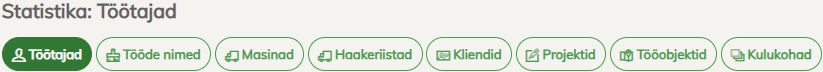 Lehe ülemised sakid/tabid, nagu Töötajad, Tööde nimed, Masinad, ja teised, esindavad Statistikuid.